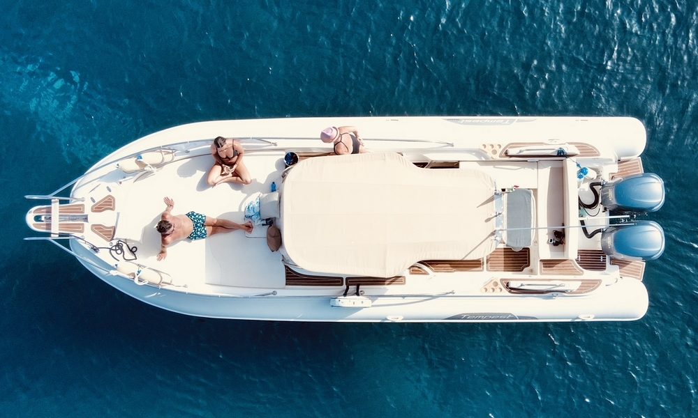 Naviga nel lusso con il nostro top di gamma. Solo con lo skipper, comprende: sea scooter Yamaha, tavola da sup e drone, frigo e bibite, frutta, bottiglia di benvenuto e attrezzatura da snorkeling.