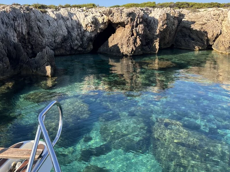Immagina una grotta segreta, nascosta lungo una scogliera frastagliata e accessibile solo via mare. L'ingresso, stretto, rivela un passaggio misterioso che conduce all'interno. Appena varcato l'ingresso, ti trovi in un mondo incantato. Le acque cristalline all'interno della grotta rivelano sfumature di azzurro e verde che sembrano danzare alla luce del sole. I raggi solari filtrano attraverso aperture naturali nella roccia, creando giochi di luce che illuminano le pareti di pietra e creano riflessi scintillanti sulla superficie dell'acqua. Le pareti sono intarsiate da segni del tempo e da piccole nicchie che sembrano custodire segreti antichi. La grotta potrebbe rivelarsi non adatta a persone che soffrono di claustrofobia ma con l'aiuto dei nostri skipper esperti vi guideremo in questo rifugio segreto dove il tempo sembra sospeso e ogni momento diventa un'esperienza magica. La sensazione di scoperta e la bellezza delle acque cristalline contribuiscono a rendere questa grotta un luogo unico e indimenticabile.